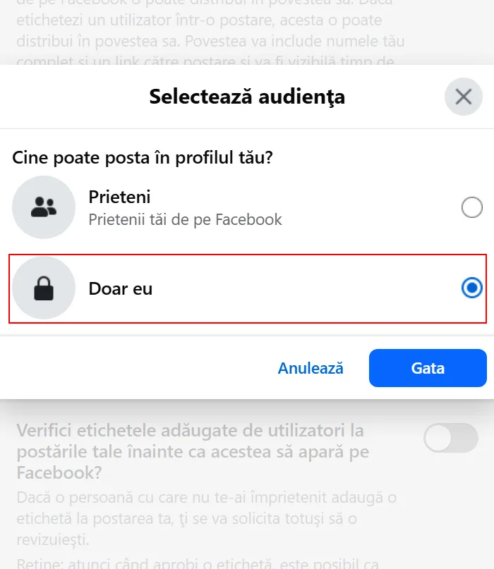 7. Apasă pe meniul vertical și selectează Doar eu.